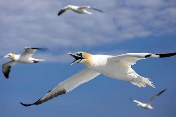 08/16/2025: Northern Gannets flying beside our boat during a seabird tour in the Shetland Islands.